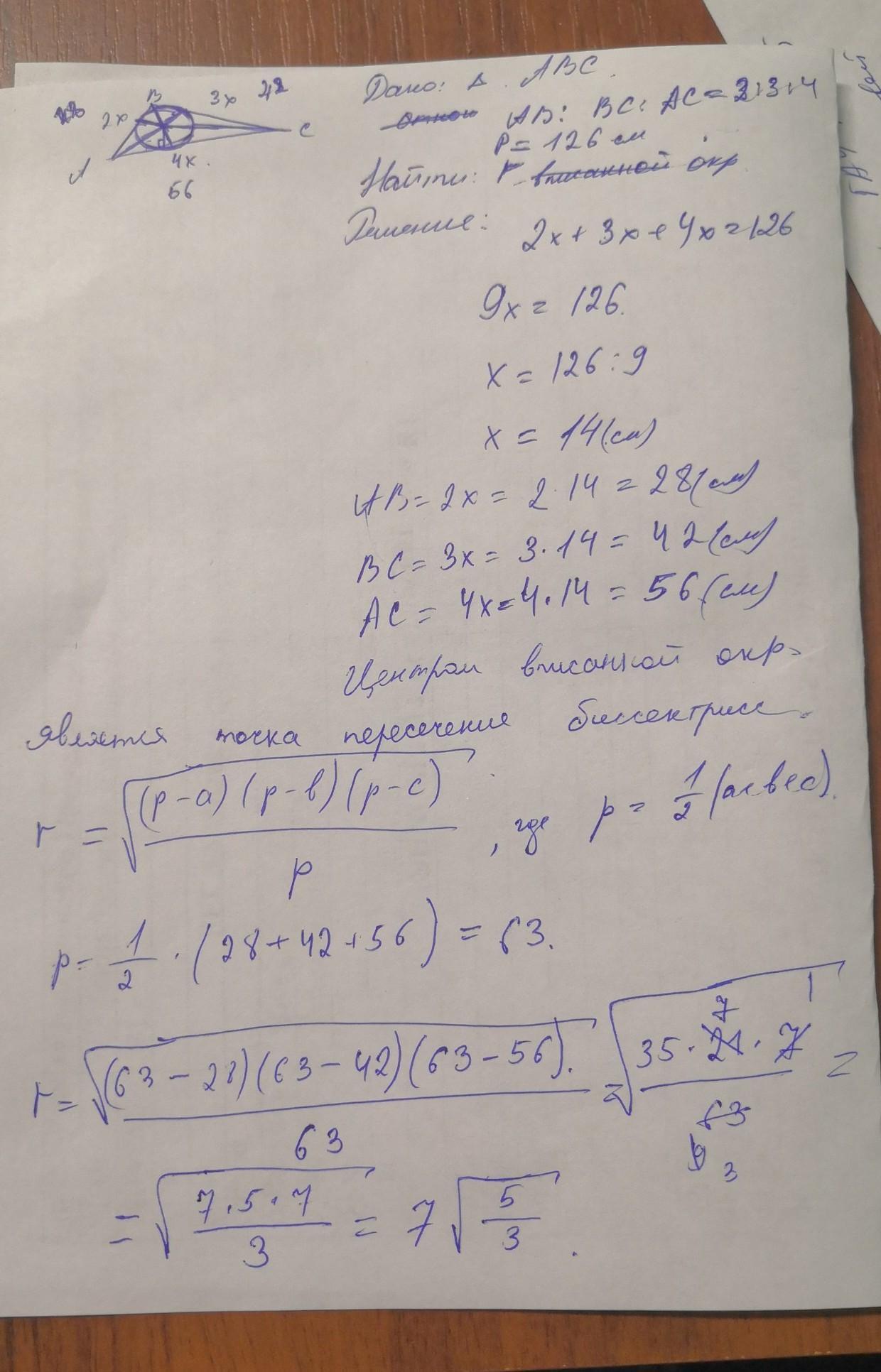 периметр треугольника равен 126 см, отношения сторон -2;3;4. Найди радиус окружности , вписанной в треугольник