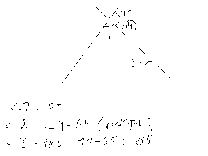 Разберёмся, <2=55, <1=40. Обозначим ещё 1 угол, назовем его <4(Снизу рисунок прикреплю)