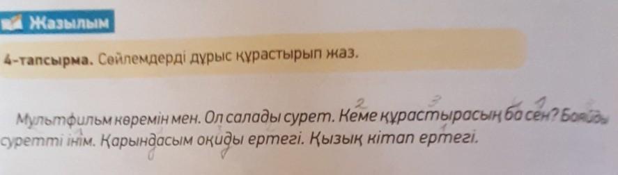 Мен мультфильм көремін. Ол сурет салады.Сен кеме құрастырасың ба? Інім суретті бояйды. Қарындасым ертегі оқиды. Ертегі қызық кітап.