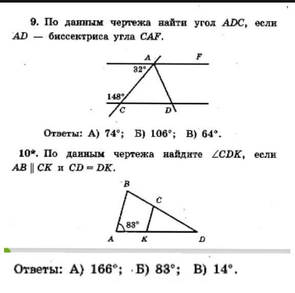 9. угол А равен 180-32=148 весь, но АD биссект. значит нужная нам часть это 148:2 = 74