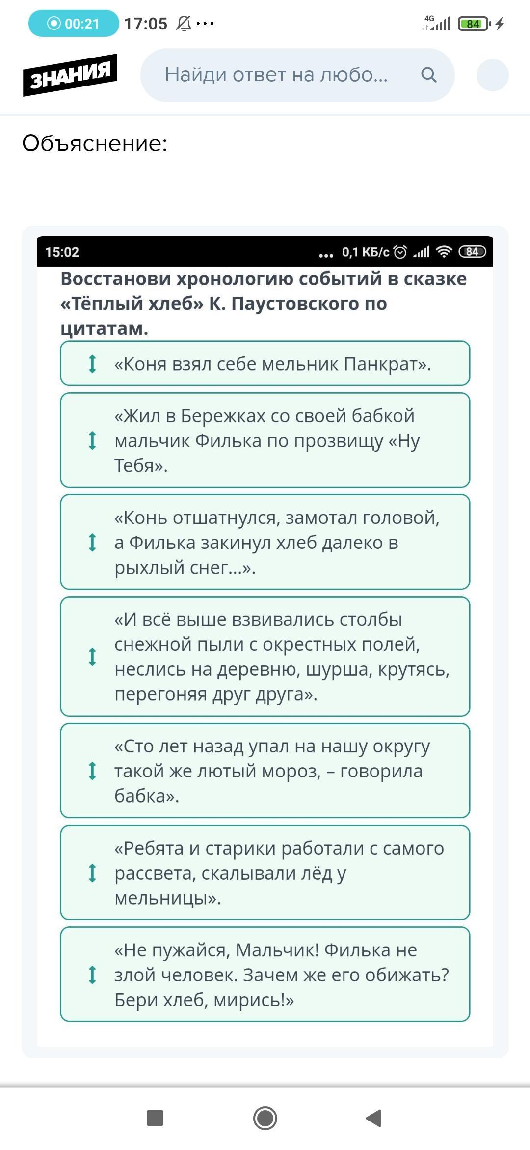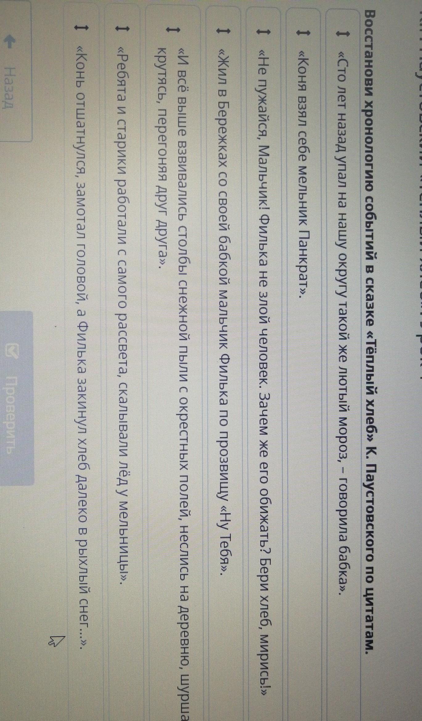 Восстанови хронологию событий в сказке «Тёплый хлеб» К. Паустовского по цитатам.