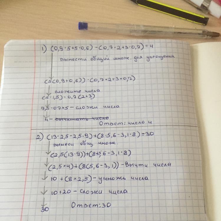1. (0,9 * 5 + 5 * 0,6) - (0,7 * 2 + 3 * 0,7) = (5 * (0,9 + 0,6)) - (0,7 * (2 + 3)) = 5 * 1,5 - 0,7 * 5 = 5 * (1,5 - 0,7) = 5 * 0,8 = 4