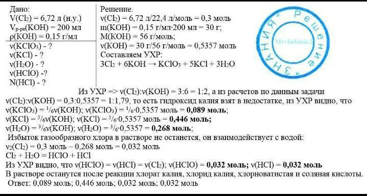 помагает пожалуйста Хлор объемом 6,72 л (н.у.) пропустили через 200 мл раствора гидроксида калия, в 1 мл которого содержится 0,15 г вещества. Какие вещества и в каком количестве содержатся в растворе после окончания реакции