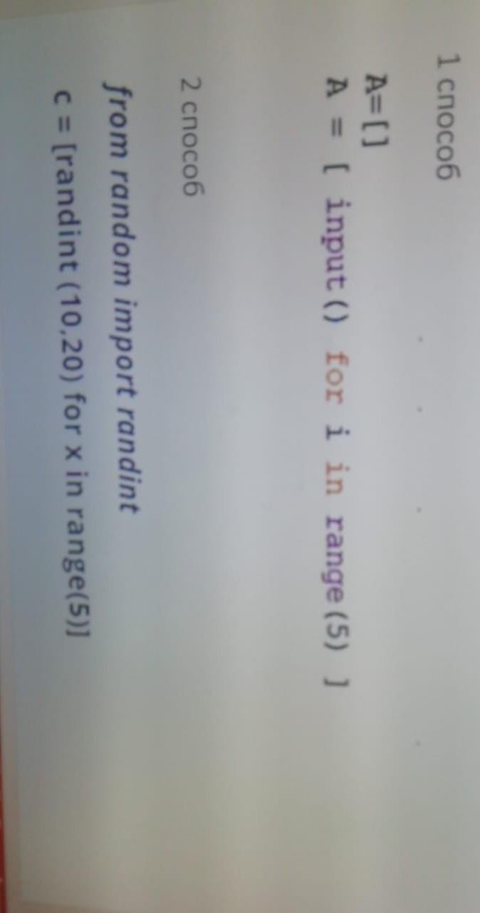 ПОЖАЛУЙСТА. Помогите пожалуйста очень срочно нужно.<br /> Python<br /> 1 вопрос - указаны 2 способа задания массива. Укажите где какой способ?