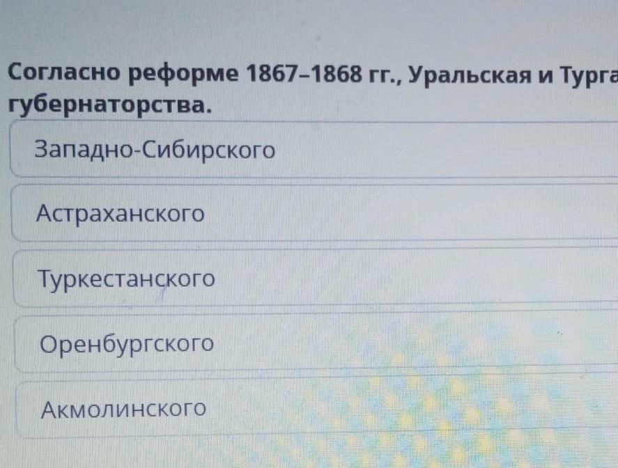 Согласно реформе 1967-1868гг., Уральская и Тургайская области вошли в состав... генерал губернаторства.