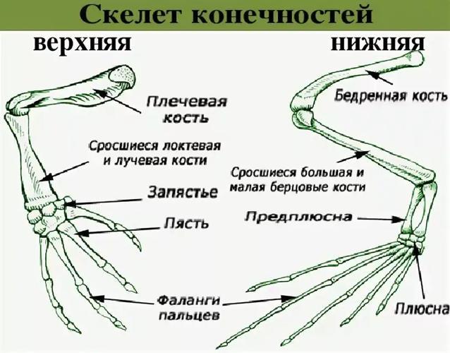 Ответ: Лягушка . Передние конечности лягушки состоят из плеча, предплечья и кисти, а задние - из бедра, голени и стопы. Локтевая и лучевая, а также большая и малая берцовые кости у лягушки срастаются.
