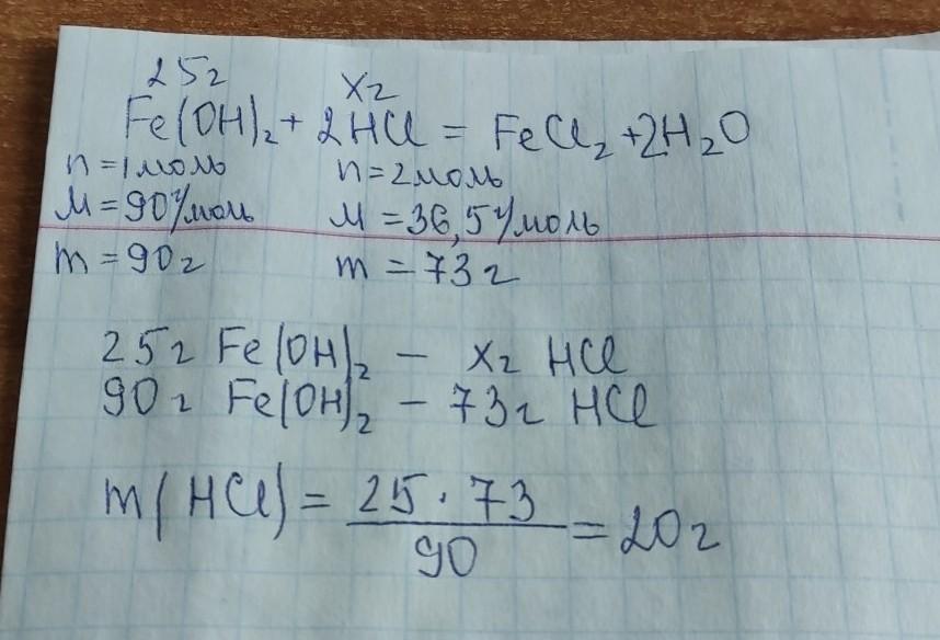 Вычислите массу соляной кислоты, которой потребуется для растворения 25г гидроксида железа 2