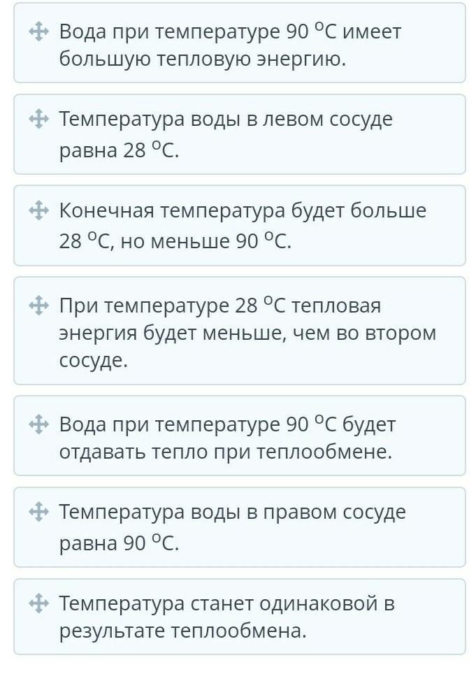 Выводы по рисунку: вода при температуре 90г будет отдавать тепло при теплообмене. при температуре 28г тепловая энергия будет меньше , чем во втором сосуде. вода при температуре 90г имеет большую тепловую энергию.