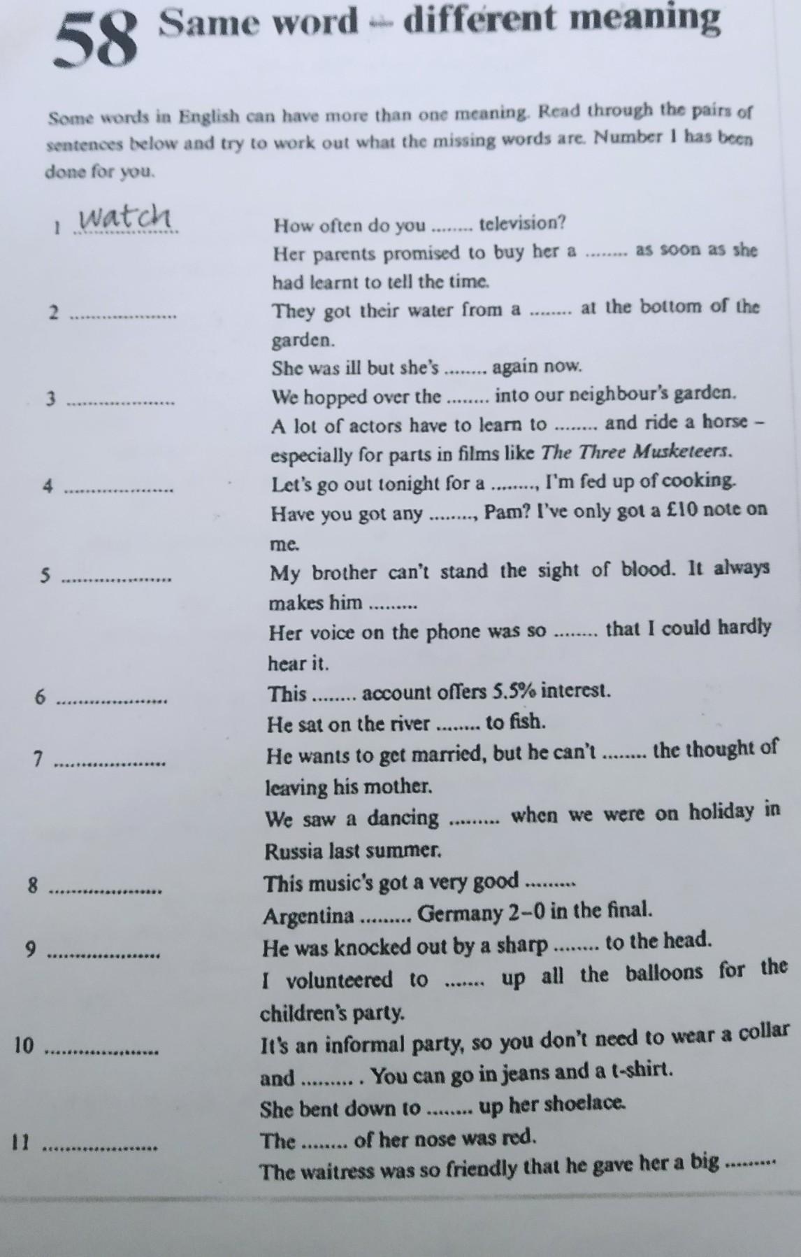 SOLUTION: 1watch, 2well, 3fence, 4change, 5faint, 6bank, 7bear, 8beat, 9blow, 10tie, 11tip.