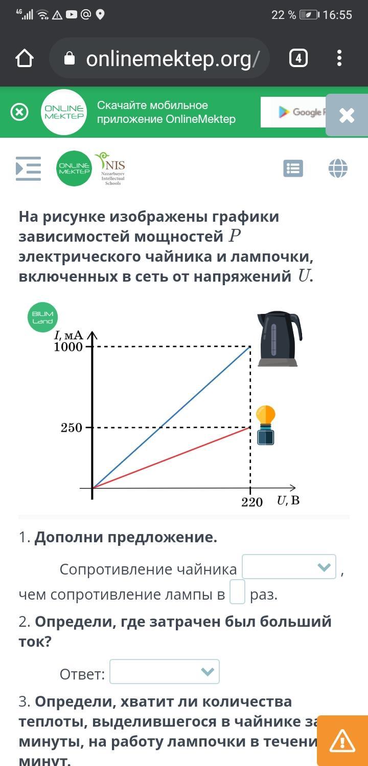 3. Определи, хватит ли количества теплоты, выделившегося в чайнике за 3 минуты, на работу лампочки в течение 10 минут.