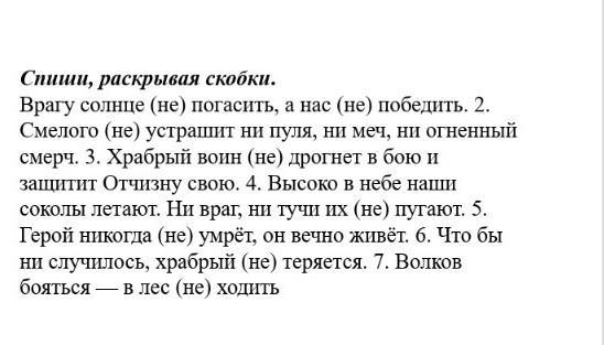 Врагу солнце не погасить, а нас не победить. 2. Смелого не устрашит ни пуля, ни меч, ни огненный смерч. 3. Храбрый воин не дрогнет в бою и защитит Отчизну свою. 4. Высоко в небе наши соколы летают. Ни враг, ни тучи их не пугают. 5. Герой никогда не умрёт, он вечно живёт. 6. Что бы ни случилось, храбрый не теряется. 7. Волков боятся - в лес не ходить.