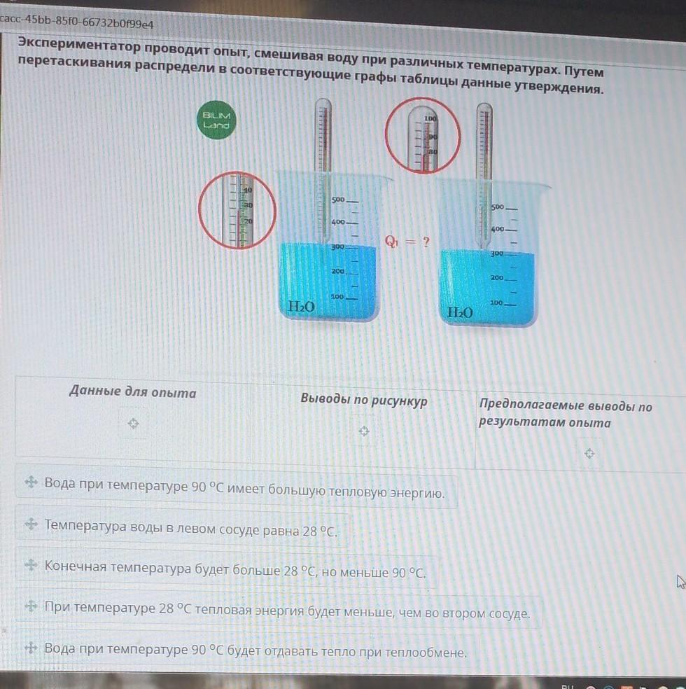 Предполагаемые выводы по результатам опыта: Вода при температуре 90°© имеет большую тепловую энергию. При температуре 28°© тепловая энергия будет меньше, чем во втором сосуде. Вода при температуре 90°© будет отдавать тепло при теплообмене