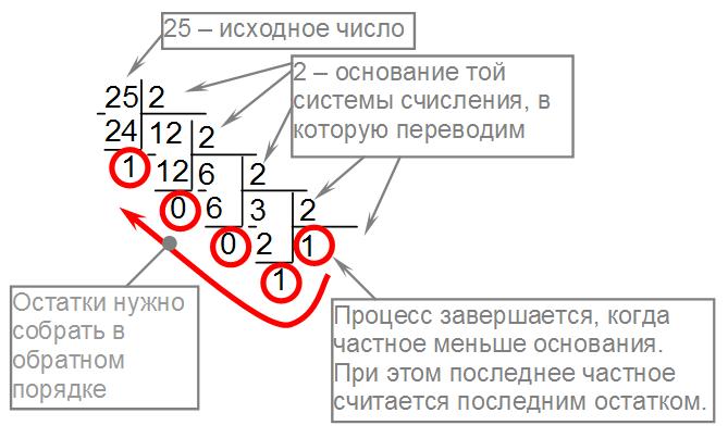 Для того, чтобы перевести число из десятичной системы счисления, в любую другую, нужно выполнять целочисленное деление исходного числа на основание той системы счисления, в которую нужно перевести число. При этом важен остаток от деления и частное. Частное нужно делить на основание до тех пор, пока не останется 0. После этого все остатки нужно выписать в обратном порядке - это и будет число в новой системе счисления.