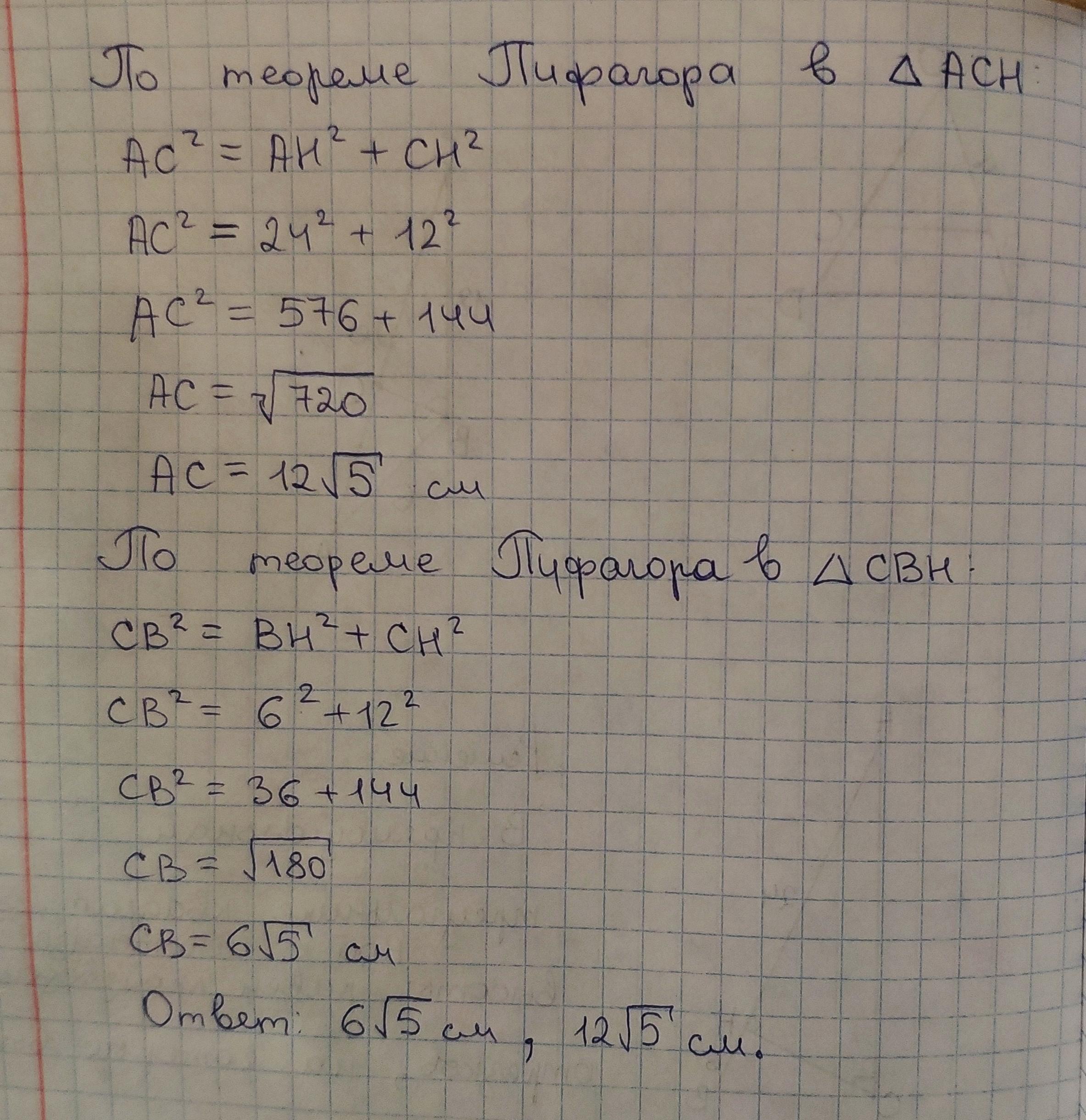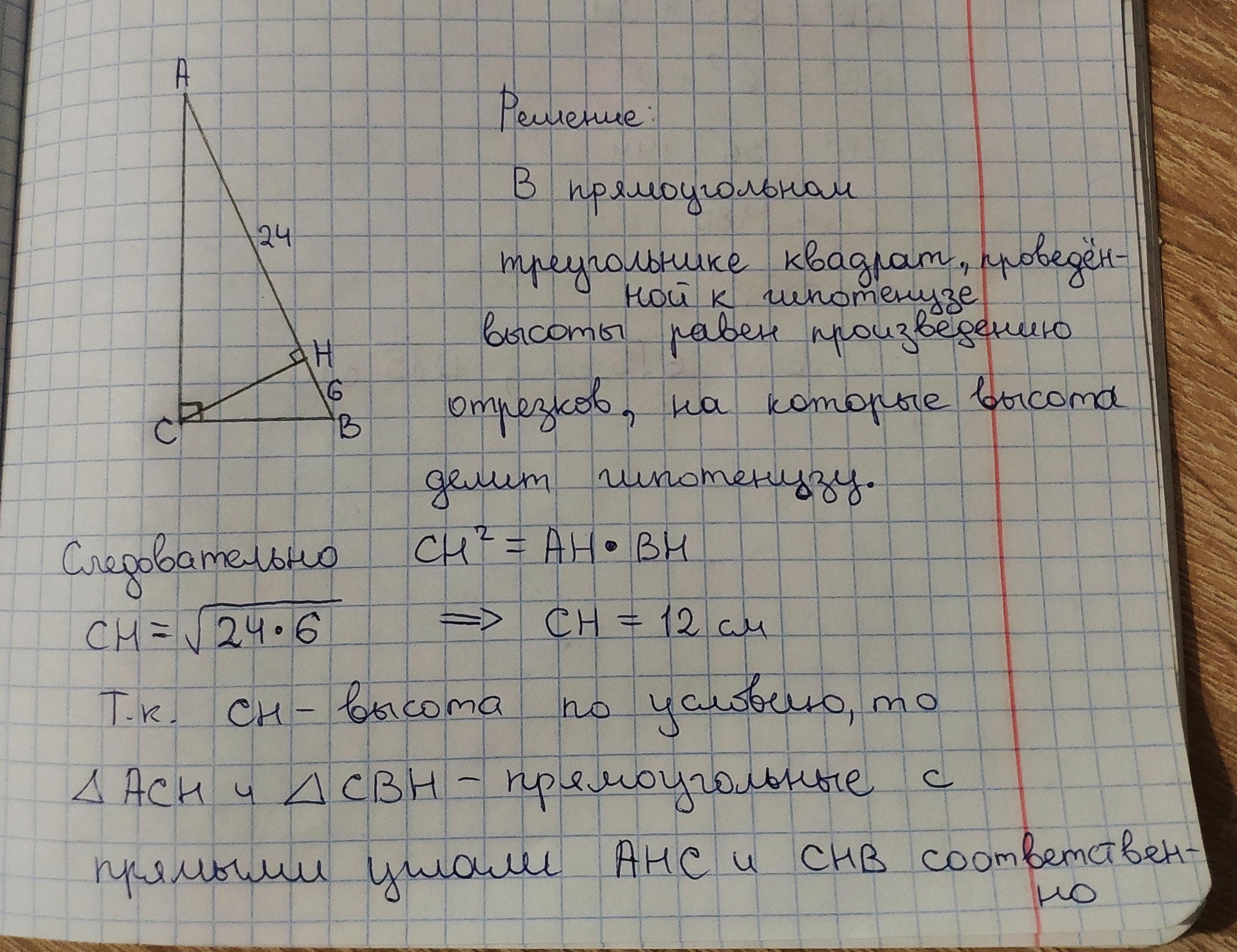 Висота прямокутного трикутника проведена до гіпотенузи поділяє її на відрізки завдовжки 6 і 24 см. Знайдіть катети трикутника.