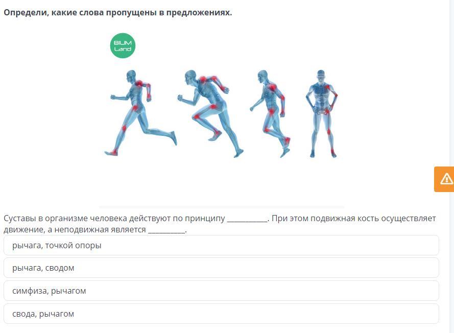 Биомеханические особенности движения человека в связи с прямохождением Определи, какие слова пропущены в предложениях. Суставы в организме человека действуют по принципу ___________. При этом подвижная кость осуществляет движение, а неподвижная является __________.