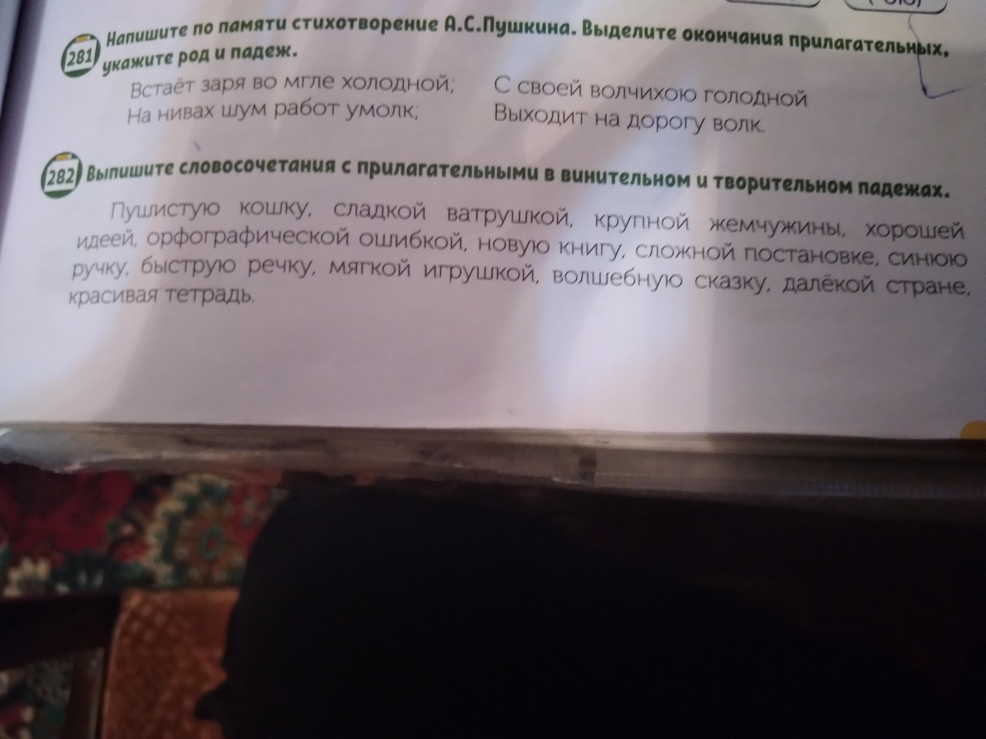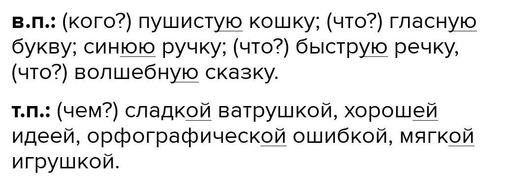 Пушистую кошку, сладкой ватрушкой, хорошей идеей, орфографической ошибкой, новую книгу, синюю речку, мягкой игрушкой, волшебную сказку.