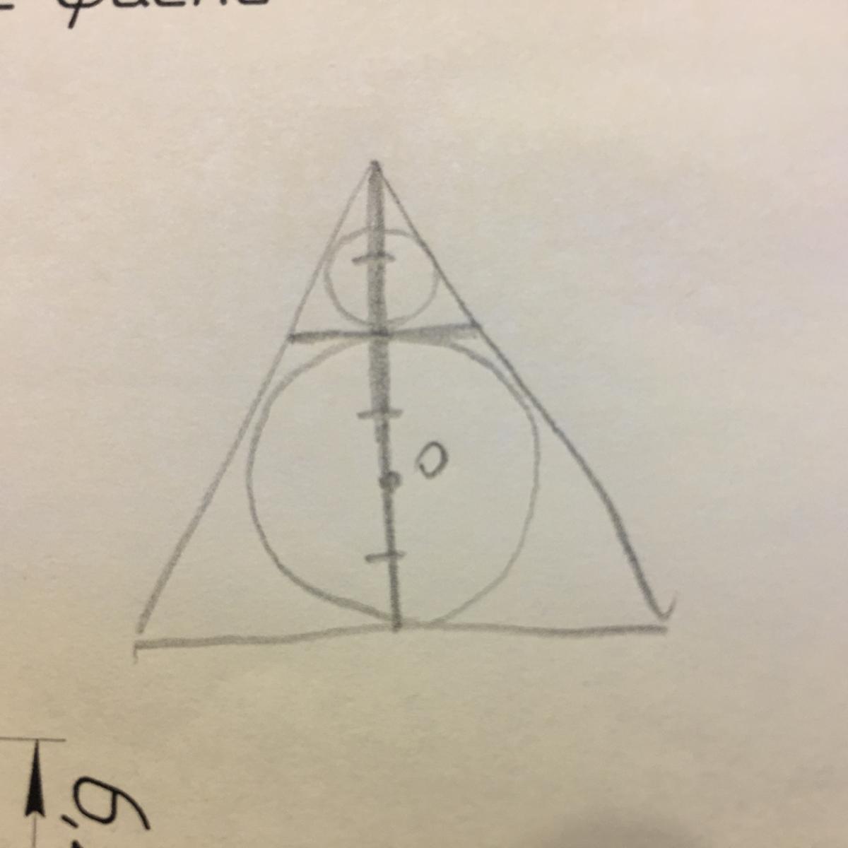 Проведём касательную параллельно основанию, как показано на рисунке. Полученный треугольник правильный. В него и вписана вторая окружность.