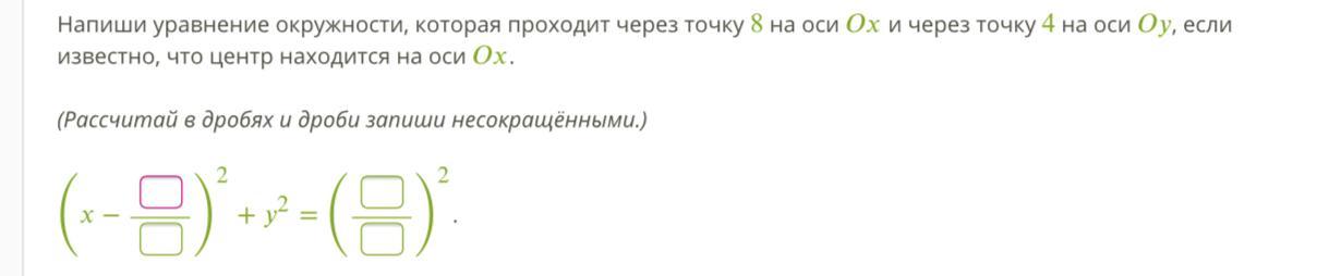 Напиши уравнение окружности, которая проходит через точку 8 на оси и через точку 4 на оси , если известно, что центр находится на оси . 25б