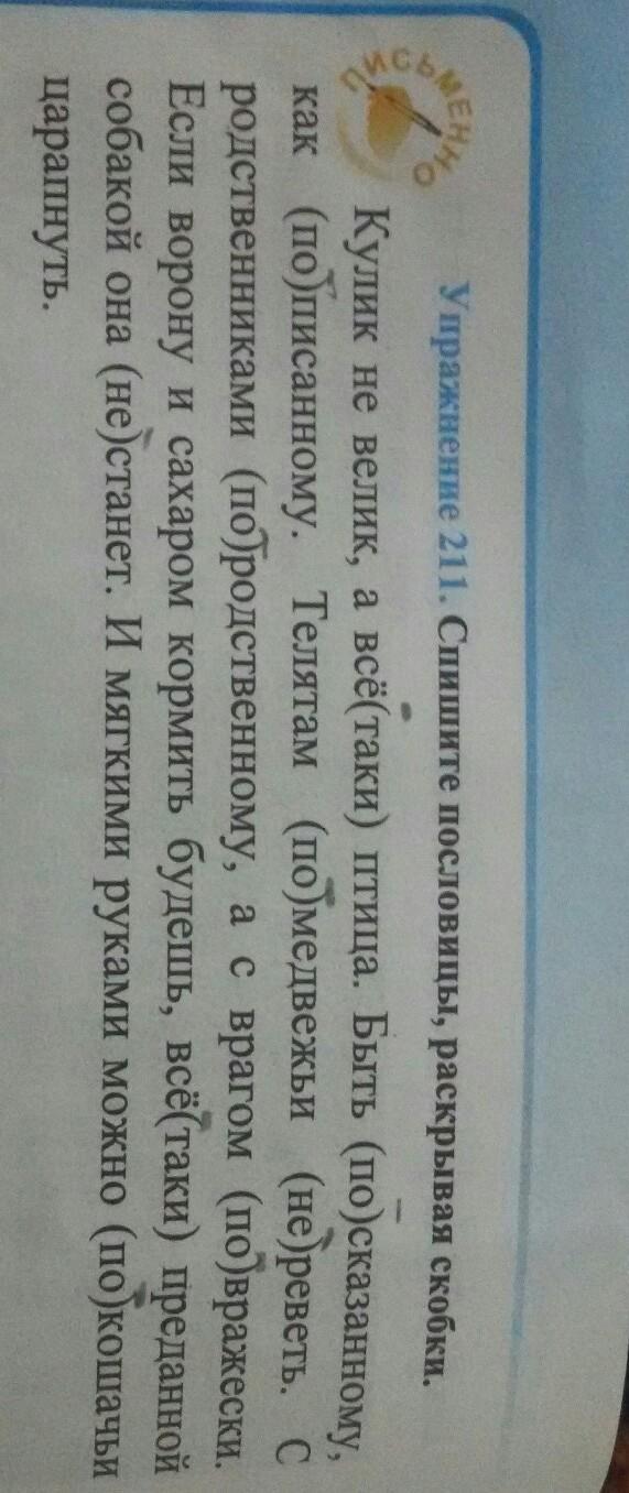 Кулик невелик, а все-таки птица.Быть по-сказанному, что по-писаному. Телятам по-медвежьи не реветь. С родственниками по- родственному, а с врагами по-вражески. Если ворону и сахаром кормить будешь, все-таки преданной не станет. И мягкими руками можно по кошачьи царапнуть.