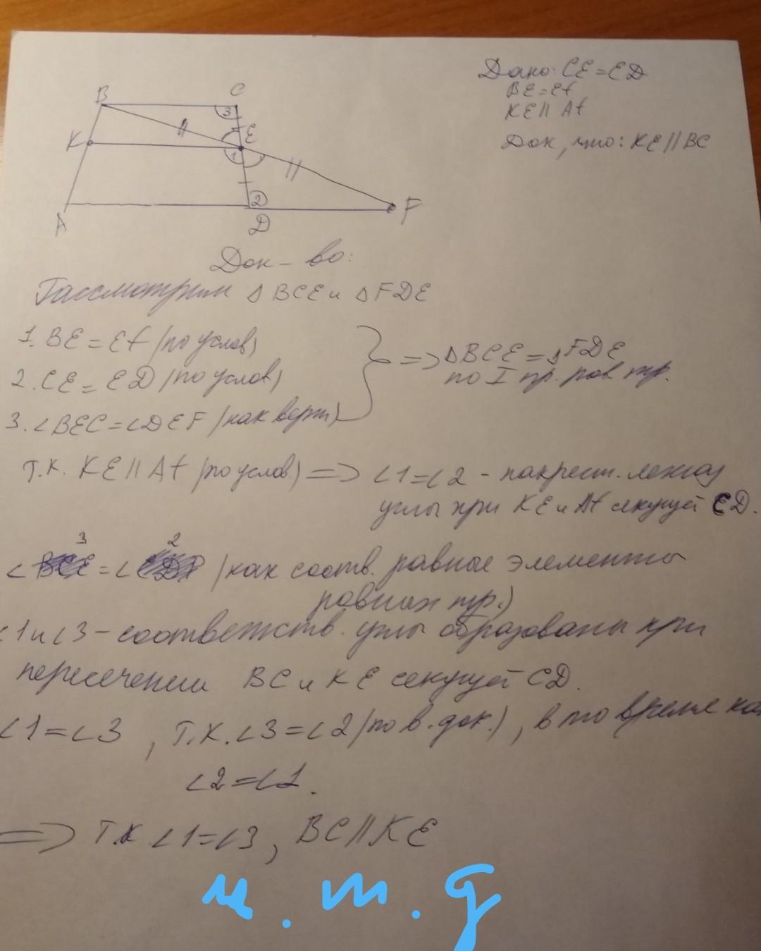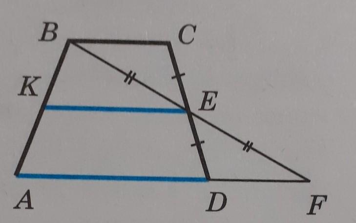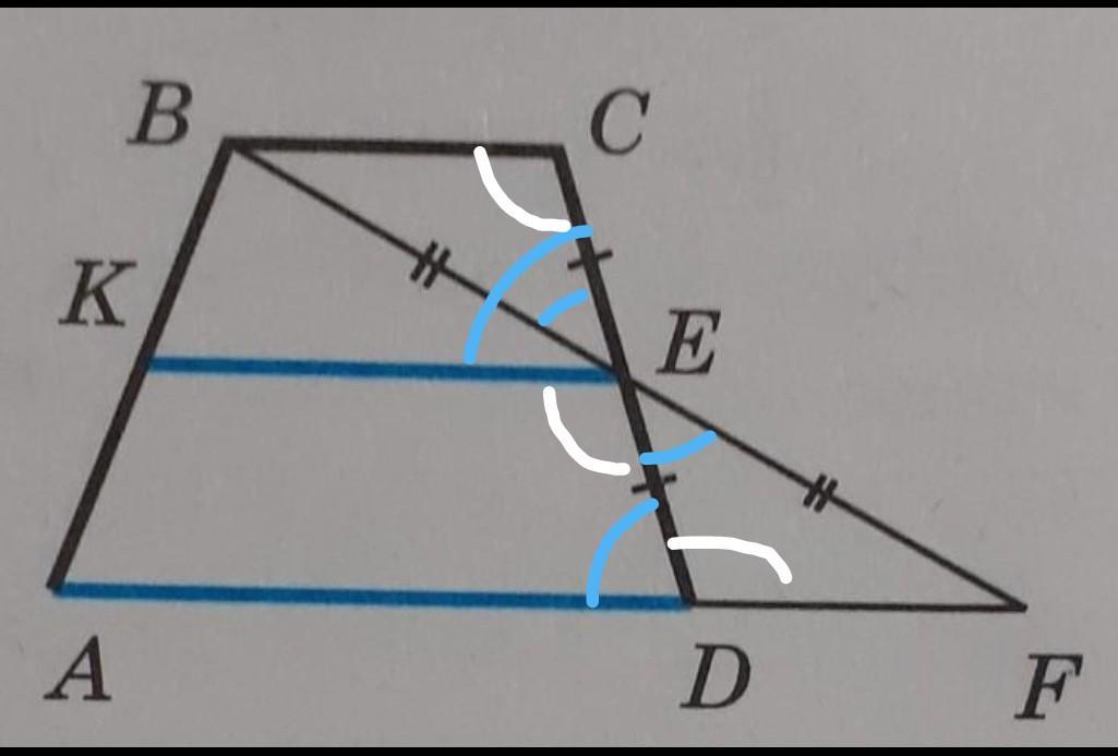 Треугольники BCE и FED равны по двум сторонам и углу между ними (вертикальные углы).Тогда углы СBE и EFD равны, они накрест лежащие для прямых DF и BC и секущей BF.Тогда DF||BC, но KE||AD => KE||BC