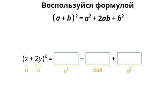 Второе число: 2*a*b то есть 2 умножить на первое число и умножить на второе, для нашего примера это 2* х* 2у = 4ху
