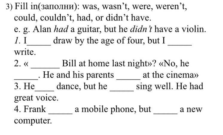 3) Fill in(заполни): was, wasn’t, were, weren’t, could, couldn’t, had, or didn’t have.