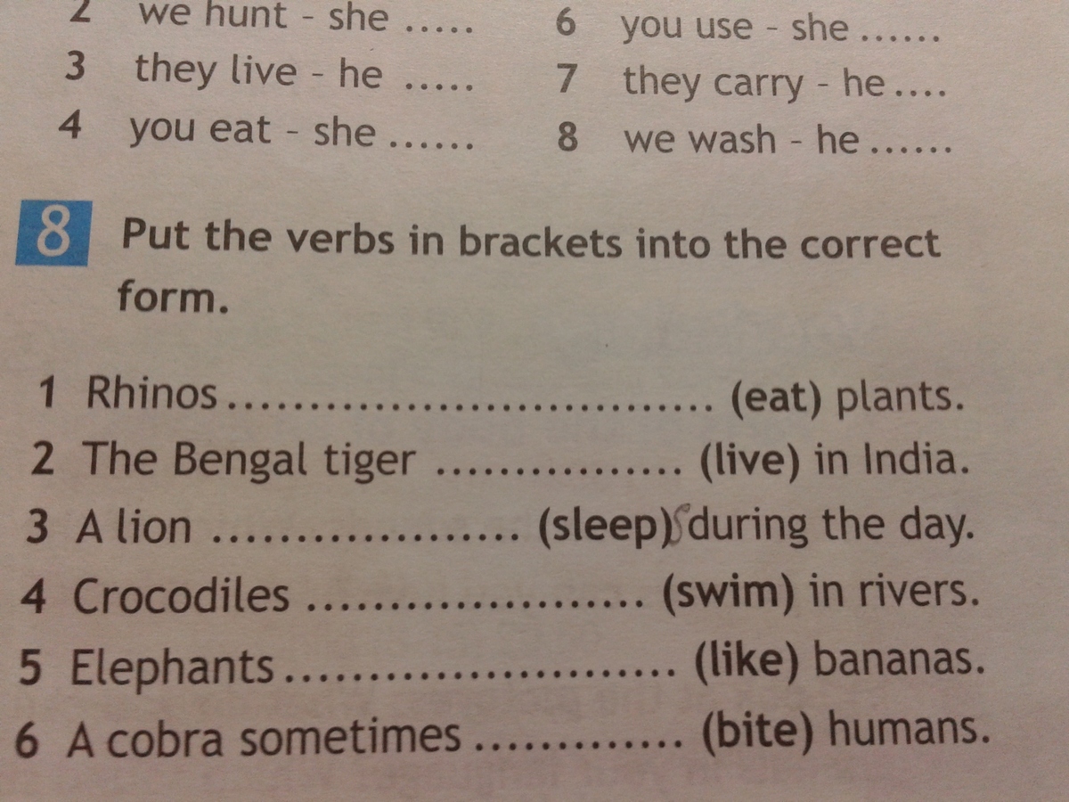 8 1 eat 2 lives 3 sleeps 4 swim 5 like 6 bites