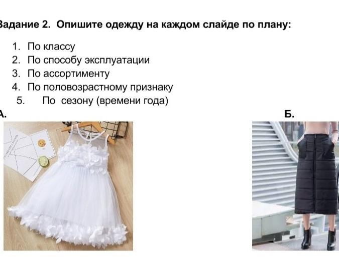 Задание 2. Опишите одежду на каждом слайде по плану: 1. По классу 2. По способу эксплуатации 3. По ассортименту 4. По половозрастному признаку По сезону (времени года) 5. А. Б.