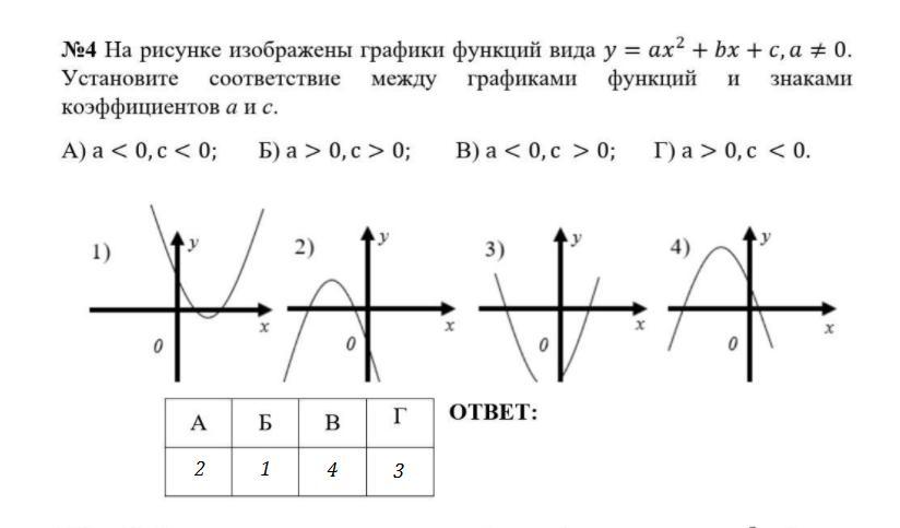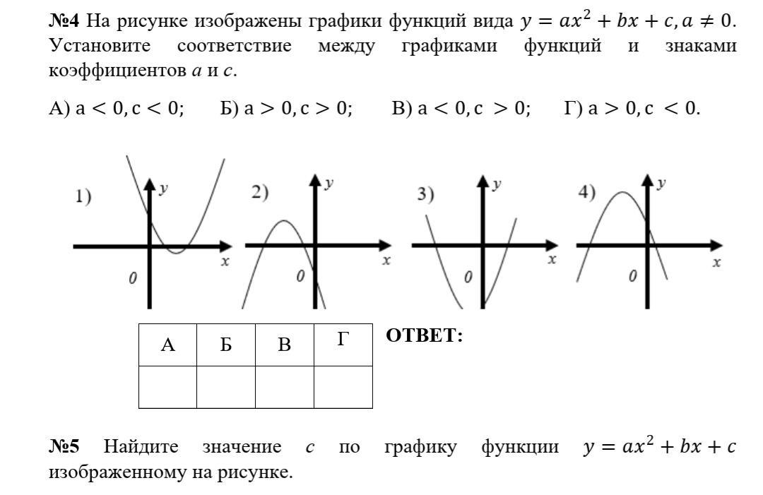 №4 На рисунке изображены графики функций вида y=ax^2+bx+c,a≠0. Установите соответствие между графиками функций и знаками коэффициентов a и c.