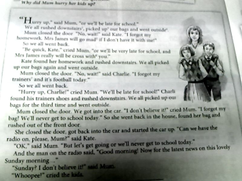 Мама закрыла дверь.Стой,не закрывай,крикнула Кейт.Я забыла домашнее задание.Если я его не принесу, мистер Джеймс будет не доволен.