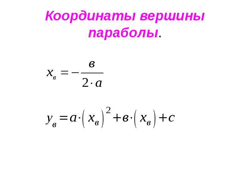 Вершину можем найти по формуле (см. слайд) или же если возьмём производную от нашей функции, а потом приравняем её к 0.