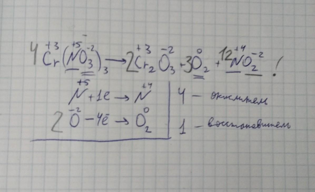 Подберите коэффициенты методом электронного баланса в уровнениях реакций: Cr(NO3)3=Cr2O3+NO3+O2