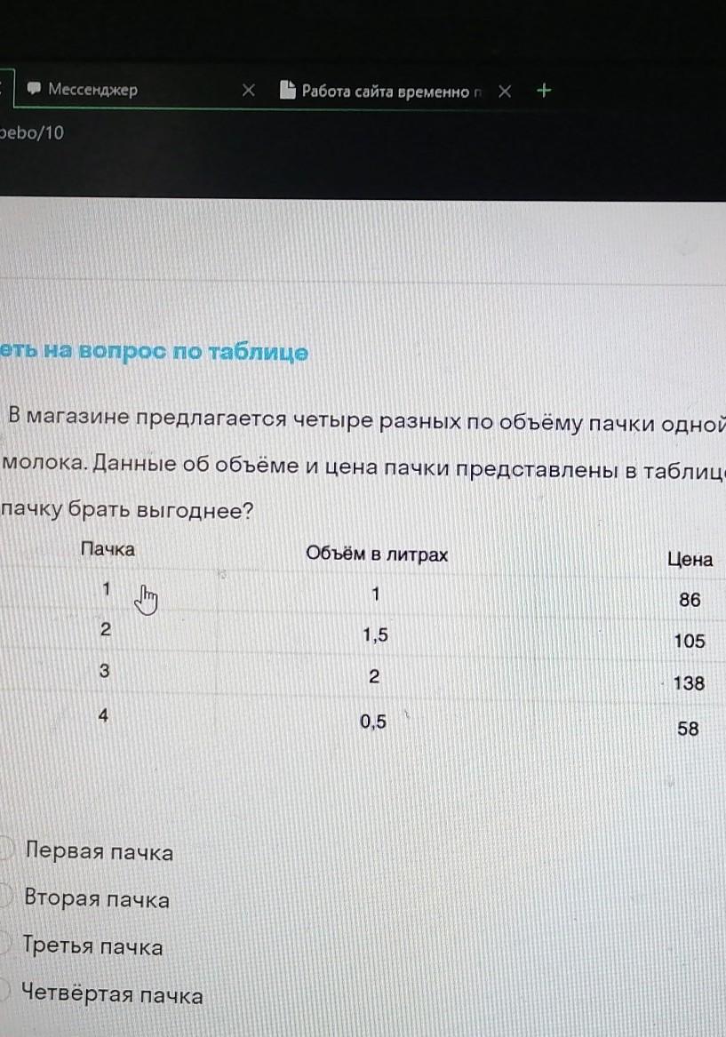 Отсюда следует, что выгоднее брать 3-ю пачку молока с объёмом 2 л.