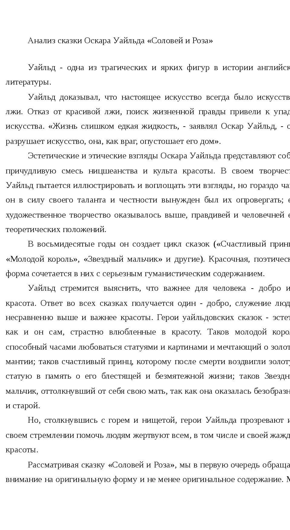 Произведение Оскара Уайльда «» является философской сказкой о любви и ее проявлениях. Главные герои – студент, Соловей, Розовый Куст. С первых строк произведения читатель узнает о том, что студент безнадежно влюблен в дочку профессора. В ближайшее время ожидается бал и девушка сказала Студенту, что будет танцевать с ним, если он подарит ей красные розы. Студент расстроен: в его саду «нет ни одной красной розы». Горестные сетования студента слышит Соловей, он удивлен, «от каких пустяков зависит порою счастье». И Соловей, увидев «настоящего влюбленного» решает ему помочь. Он размышляет о том, что «любовь – это чудо; она драгоценнее изумруда и дороже прекраснейшего опала, жемчуга, и гранаты не могут купить ее, и она не выставляется на рынке…» В это время Студент падает ничком на траву и горько плачет: он не знает, где найти красную розу для девушки. Вокруг него собираются маленькая Ящерица и Бабочка, к нему склоняется Маргаритка. «О чем он плачет?» - спрашивают они, а когда узнают, то смеются. Один только Соловей понимает страдания Студента. Он расправляет свои крылышки и летит на знакомую лужайку, где растет розовый куст. Соловей просит у него «одну красную розу», но куст отвечает, что «его розы белые» и советует лететь к брату, «что растет возле старых солнечных часов». Не теряя ни минуты, Соловей летит к указанному месту. Но и этот розовый куст отказывает в просьбе Соловья. «Мои розы желтые» - отвечает он, и советует лететь к Розовому Кусту, что растет под окном у Студента. Когда Соловей оказывается возле этого Куста, он вновь повторяет свою просьбу. Но Розовый Куст качает головой, говоря, что «кровь в его жилах застыла от зимней стужи, мороз побил почки, буря поломала ветки, и в этом году совсем не будет роз». С горечью Соловей спрашивает: «Есть ли способ получить одну, только одну – единственную розу?» То, что он слышит от Розового Куста – страшно. Одна – единственная роза может вырасти, но лишь в том случае, если соловей «обагрит ее кровью сердца». Для этого он должен петь песни «прижавшись грудью к шипу», и, как только шип пронзит сердце, живая кровь перельется в жилы куста, «расцветет красная роза»… Соловей понимает, что смерть – это слишком дорогая цена за красную розу, но в то же время думает, что «Любовь дороже Жизни, и сердце какой-то пташки – ничто в сравнении с человеческим сердцем!» Соловей летит в сад и поет студенту песню о Любви, о ее силе и мудрости, но Студент ни слова не понимает из песни Соловья. Песню понимает только Дуб, и горько печалится от услышанного. …Наступает ночь. Соловей летит к Розовому Кусту и садится на его ветку, прижимаясь к шипу. Чем дольше поет Соловей свою песню, тем ярче и больше становится на самом верхнем побеге роза. Бледная, она постепенно будто бы вбирает в себя цвет, и когда шип вонзается в сердце Соловья, роза становится алой, как утренняя заря. Но этого уже не видит Соловей – он лежит мертвый… В полдень Студент распахивает окно и видит великолепную красную розу. Сорвав ее, он бежит к дочери профессора. Он признается девушке в своей любви и просит ее вечером на балу «приколоть розу поближе к сердцу». В ответ девушка хмурится. Ей совсем не интересен Студент и она говорит ему, что «племянник камергера прислал настоящие каменья, а всякому известно, что каменья куда дороже цветов». Студент с горечью восклица