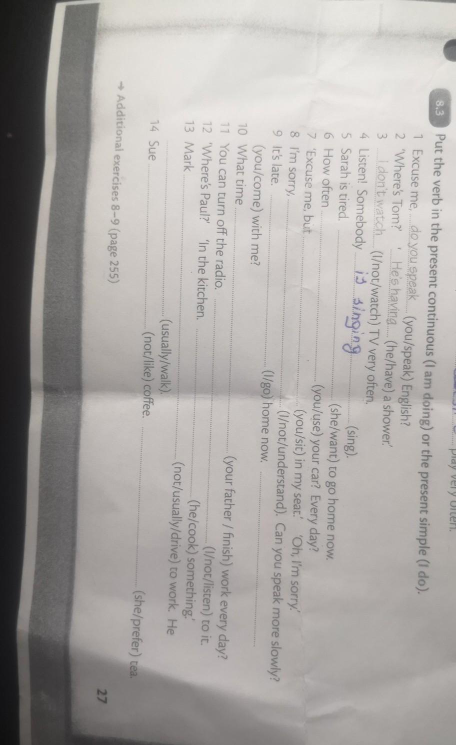 She wants, do you use, you are sitting, I don’t understand, I am going, are you coming, does your father finish, I am not listening, he is cooking, doesn’t usually drive, usually walks, doesn’t like, she prefers