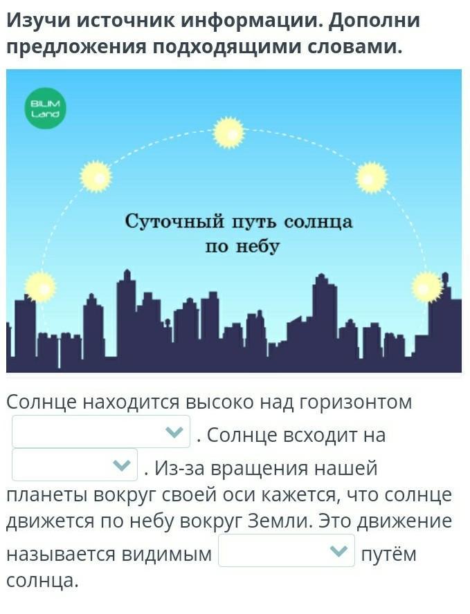 Солнце каждый день поднимается из-за горизонта в восточной части неба и зоходит на западе В полдень оно дастигает максимальной высоты.