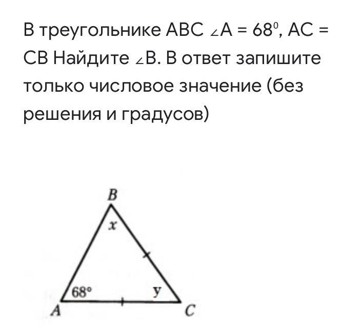 В треугольнике АВС ∠А = 68⁰, АС = СВ Найдите ∠В. В ответ запишите только числовое значение