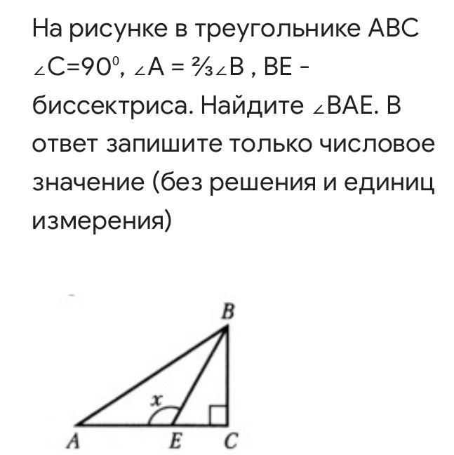 На рисунке в треугольнике АВС ∠С=90⁰, ∠А = ⅔∠В , ВЕ - биссектриса. Найдите ∠ВАЕ. В ответ запишите только числовое значение