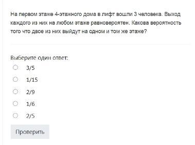 На первом этаже 4-этажного дома в лифт вошли 3 человека. Выход каждого из них на любом этаже равновероятен. Какова вероятность того что двое из них выйдут на одном и том же этаже?