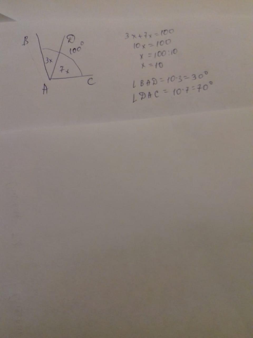 Между сторонами угла ВАС проведения луч АД. Найти углы ВАД и ДАС, если их гратусни меры относятся как 3: 7, а угол ВАС = 100 градусов