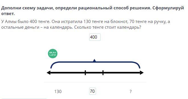 У Алмы было 400 тенге. Она истратила 130 тенге на блокнот, 70 тенге на ручку, а остальные деньги – на календарь. Сколько тенге стоит календарь?