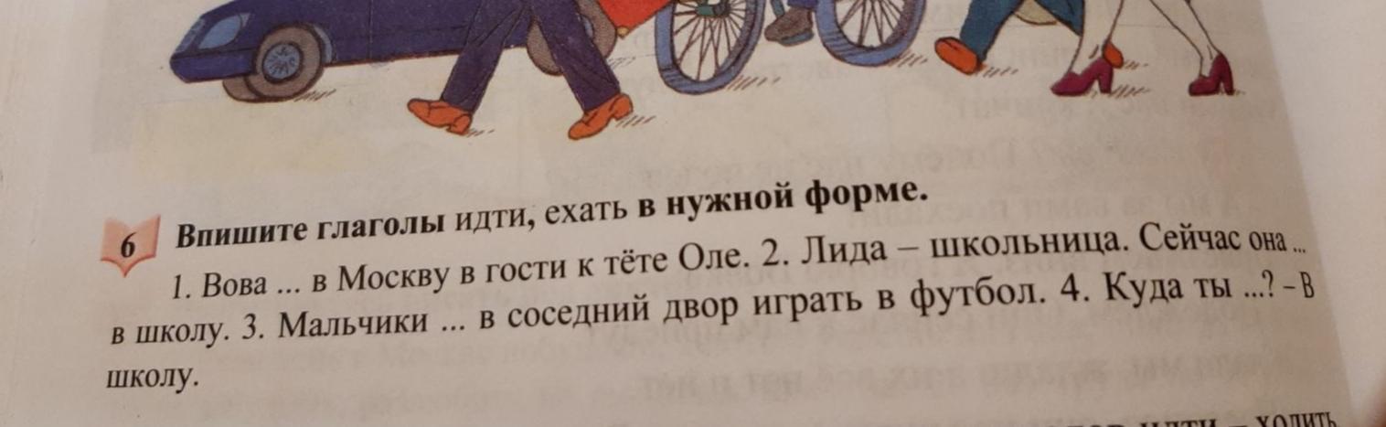 1. Вова едет в Москву в гости к тёте Оле. 2. Лида- школьница. Сейчас она идёт в школу. 3. Мальчики идут в соседний двор играть