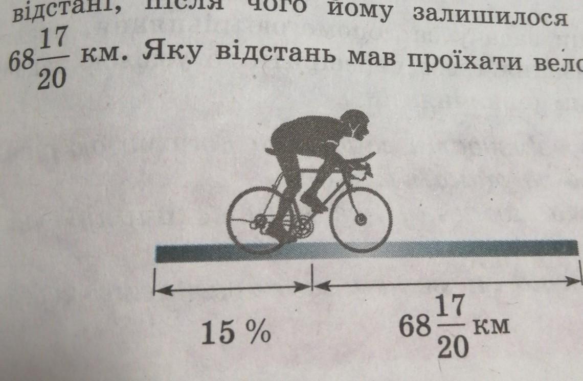За першу годину велосипедист проїхав 15% відстані, після чого йому залишилося проїхати ще 68... Яку відстань мав проїхати велосипедист?