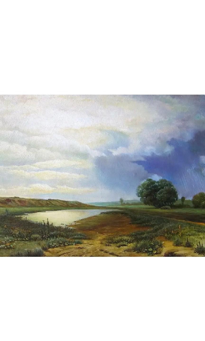 На полотне все изображено живым и дышащим и подернутая рябью вода заводи, и деревья и небо. Небо изображено особенно в фиолетово-золотых цветах. В правой части картины темные, и грозные тучи еще осыпают потоками дождя темный вдали лес, а слева уже наступает просвет светлого дня и бегут золотые облака.