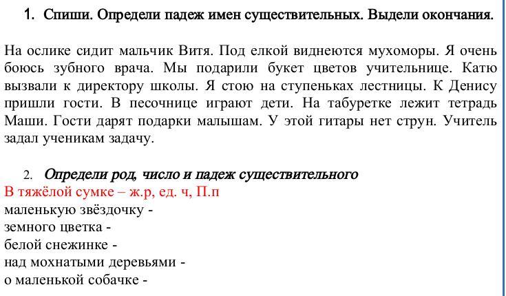 К Денису (Д. п) пришли гости ( И. п). В песочнице (П. п) играют дети (И. п). На табуретке (П. п) лежит тетрадь (И. п) Миши (Р. п). Гости (И. п) дарят подарки (В. п) малышам (Д. п). У этой гитары (Р. п) нет струн(Р. п). Учитель (И. п) задал ученику (Д. п) задачу (В. п).
