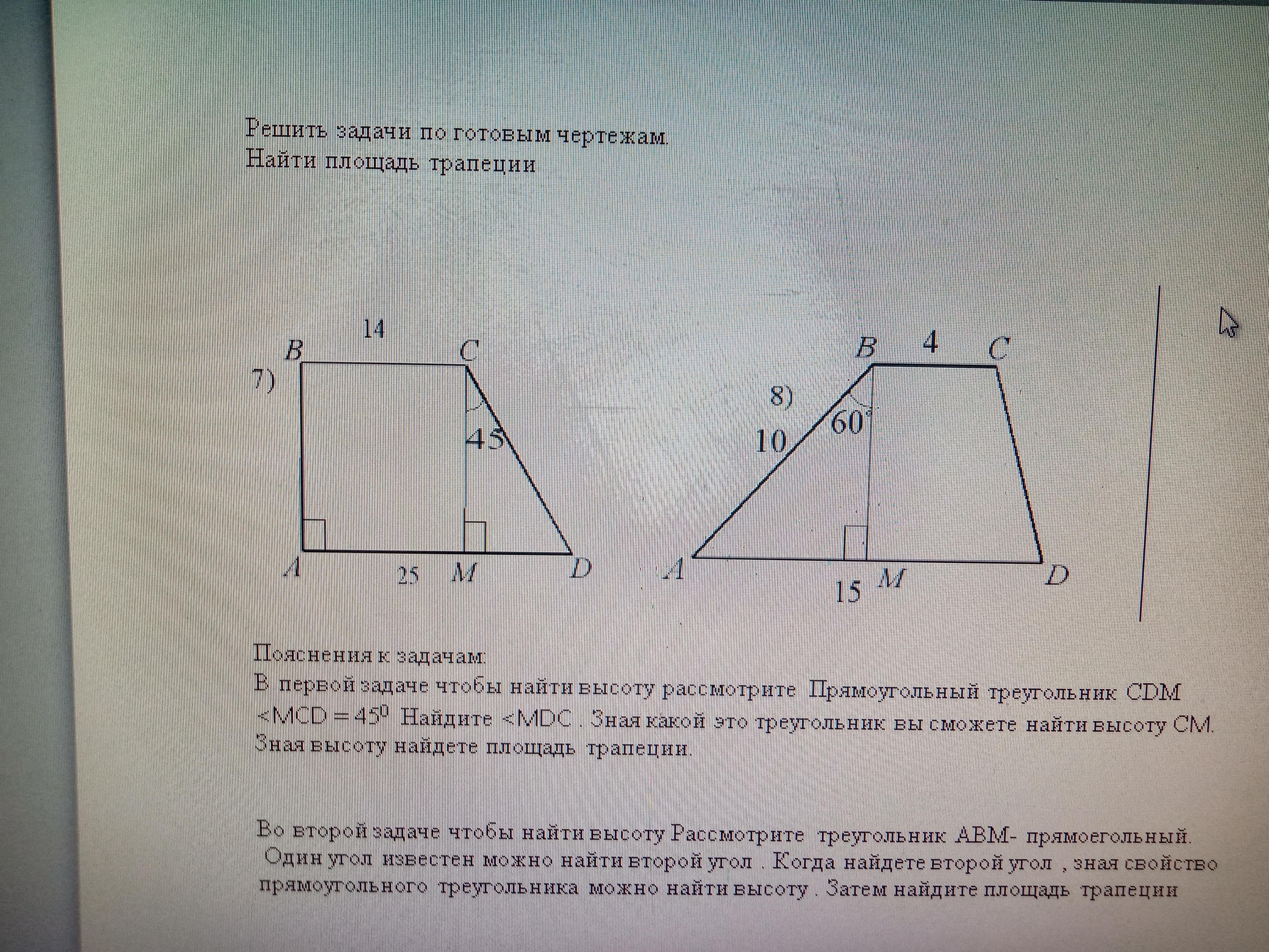 Площадь трапеции (верхнее основание+нижнее основание)/2=средняя линия. Средняя линия × высоту. Площадь