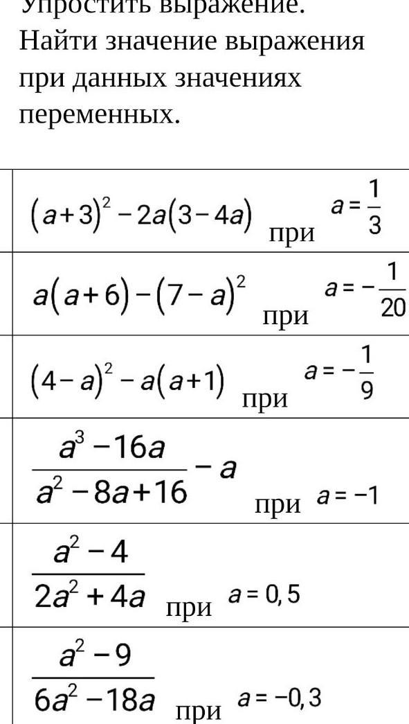 6. (a²-9)/(6a²-18a) = (a-3)(a+3)/6a(a-3) = (a+3)/6a = (-0.3+3)/(-0.3*6) = -1.5