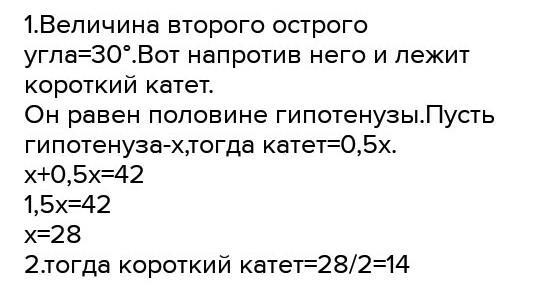 Один из острых углов прямоугольного треугольника равен 60°, а сумма меньшего катета и гипотенузы равна 42 см.