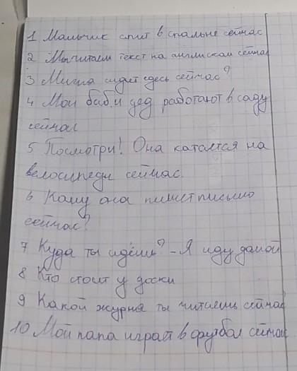 1. The boy is sleeping in the bedroom now. 2. We are reading the text in English now. 3. Is Misha sitting here now? 4. My grandparents are working in the garden now. 5. Look! She is riding a bike now. 6. Who is she writing to now? 7. Where are you going? I am going to home. 8. Who is standing at the blackboard? 9. What magazine are you reading now? 10. My father is playing football now.