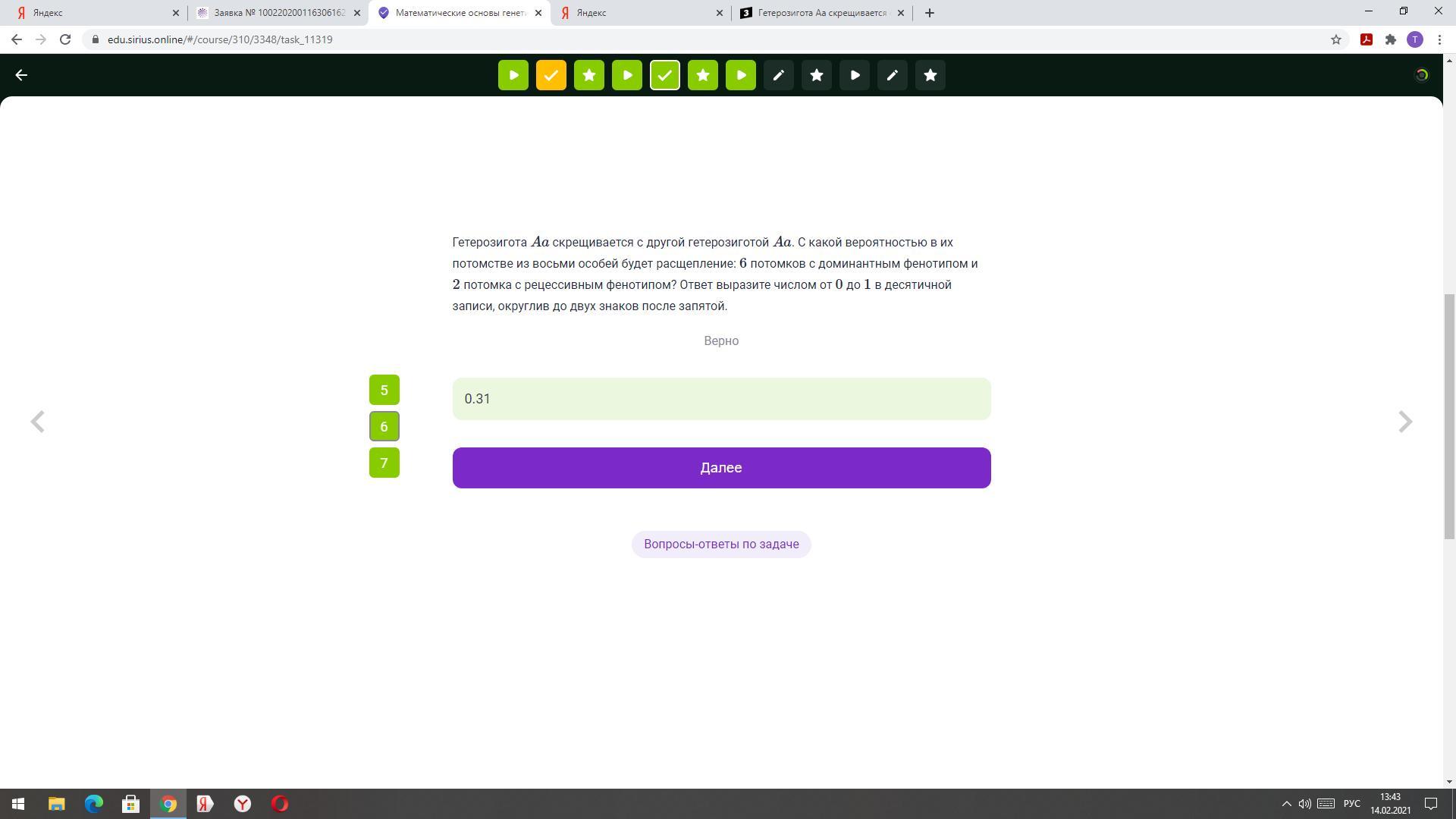 Гетерозигота Aa скрещивается с другой гетерозиготой Aa. С какой вероятностью в их потомстве из восьми особей будет расщепление: 6 потомков с доминантным фенотипом и 2 потомка с рецессивным фенотипом? Ответ выразите числом от 0 до 1 в десятичной записи, округлив до двух знаков после запятой.